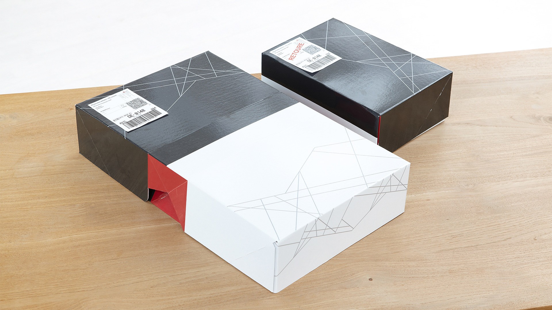 Die Verpackung DualPack verringert den CO2-Ausstoß im Versandhandel. Für den Rückversand lässt sich das Paket bei Bedarf um die Hälfte verkleinern. Der Versand von Füllmaterial entfällt. Somit können mehr Verpackungen pro LKW-Ladung transportiert werden. DualPack besteht aus Karton und Wellpappe.