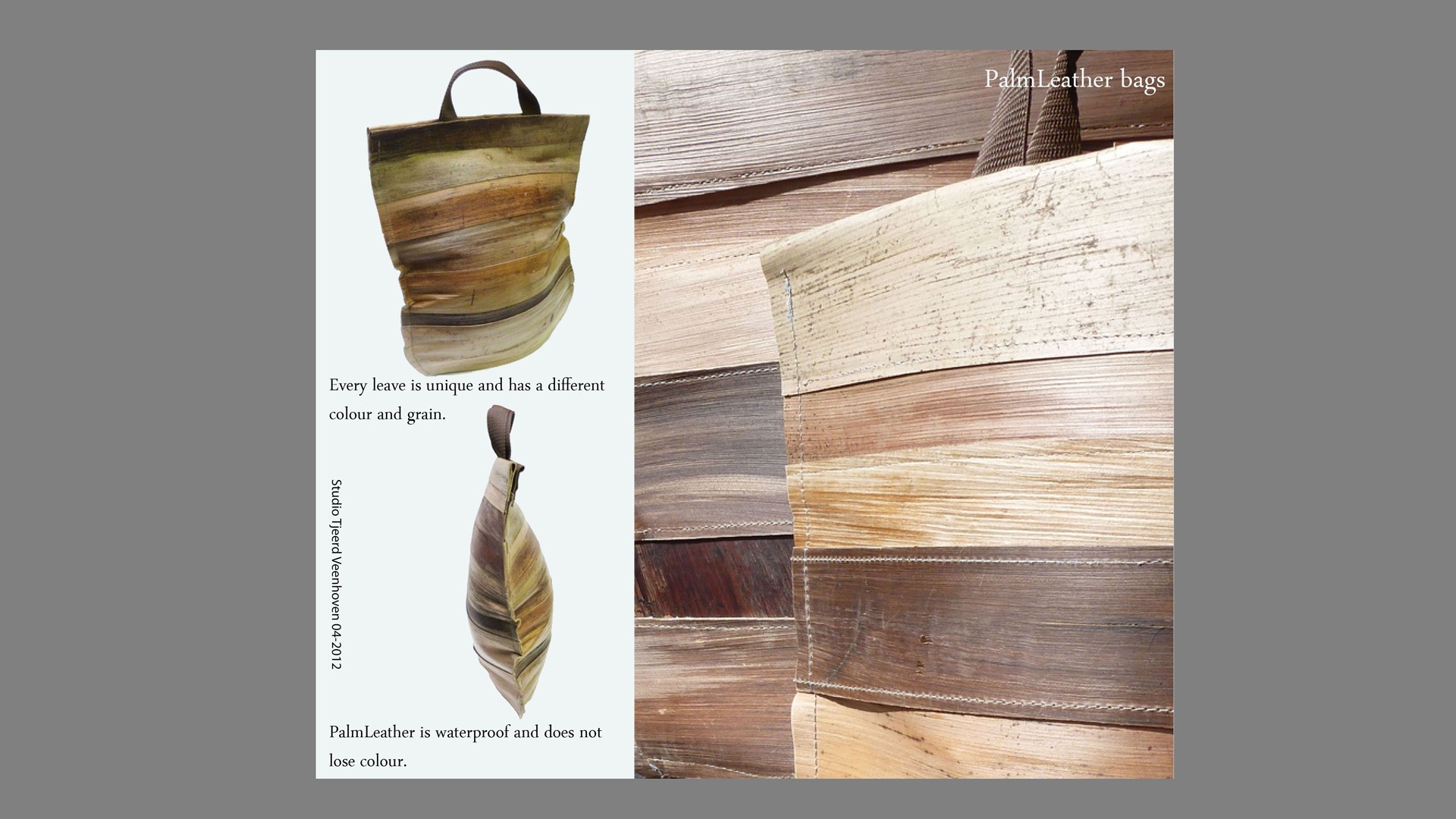 Der nachhaltige pflanzliche Lederersatz wird aus Blättern von Palmrinde gewonnen. Eine spezielle Behandlung macht das Palmleder geschmeidig. Das Verfahren ist einfach anzuwenden und ökologisch. Natürliche Farbe, Struktur und Schönheit bleiben erhalten. Bei der Verarbeitung zu Sandalen oder Taschen besteht in dem Unterschied zwischen Optik und Haptik der besondere Reiz.