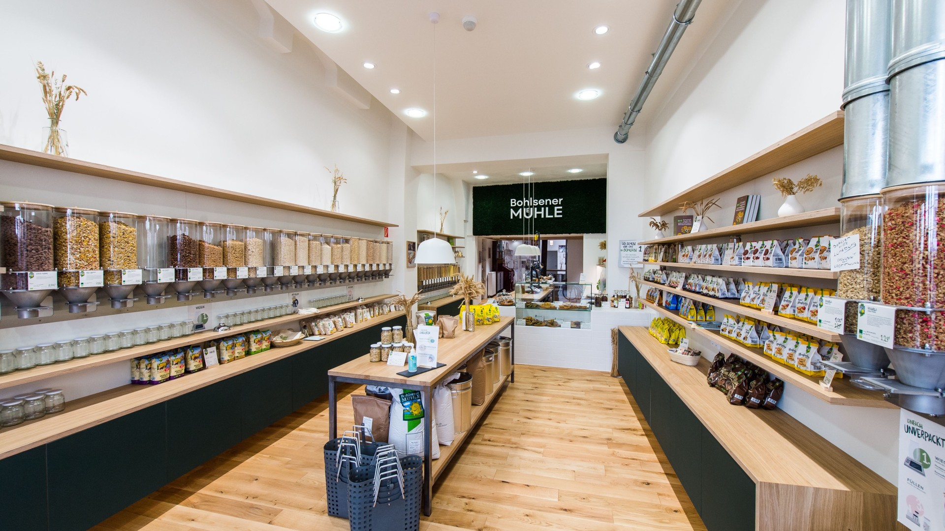 Sustainability in the retail sector needn’t begin with the product but should be considered at the point of sale. The organic brand shop at Bohlsener Mühle in Lüneburg shows how this can be done. The shop has been designed entirely in keeping with the principles of the circular economy, enabling all construction materials to be returned to the raw material cycle after use. Moreover, workshops explore the different types of grain and their processing in the mill and bakery, among other topics, and so the shop serves as a place of learning.