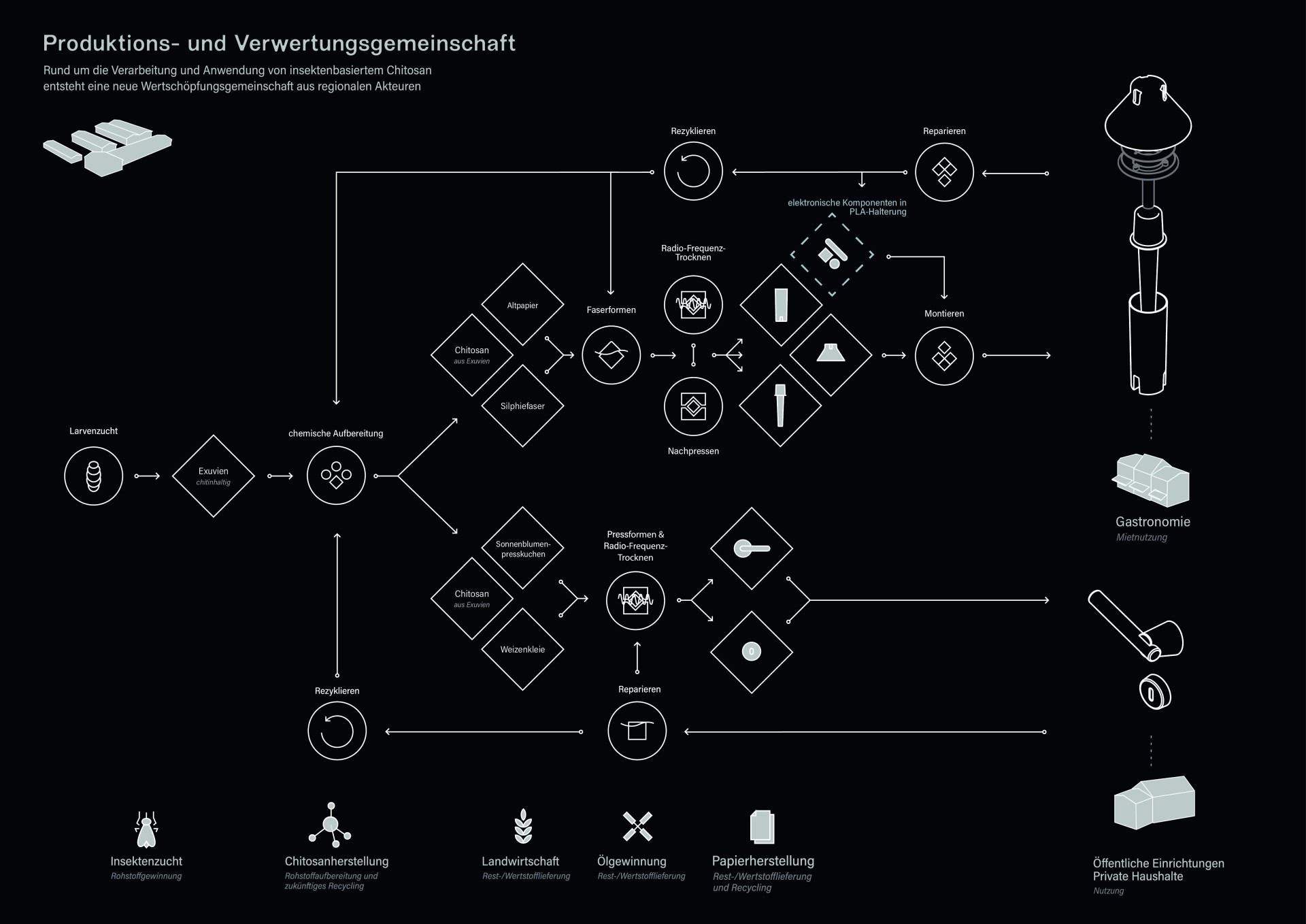 insectmatter develops circular everyday products from insect-based chitosan, working with local partners to create regional synergies. Everyday items like door handles or rental table lamps for the hospitality sector demonstrate innovative ways of creating value. The biopolymer brings together local by-products and connects agriculture, industry and design, building a collaborative network where products can circulate and find renewed purpose.