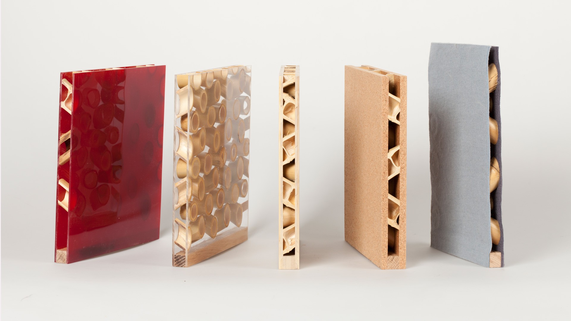 In the sandwich material CONBOU, obliquely cut bamboo is interlaced and glued between two plates. The angled nature of the cut provides a larger gluing surface, while the diagonal structure gives greater stability. The cavity between the plates offers space for electrical cables and insulation. While using significantly less resources than solid sheets, the result is a highly resilient, lightweight composite material. Moreover, the use of renewable bamboo is resource-saving and cost-effective.
