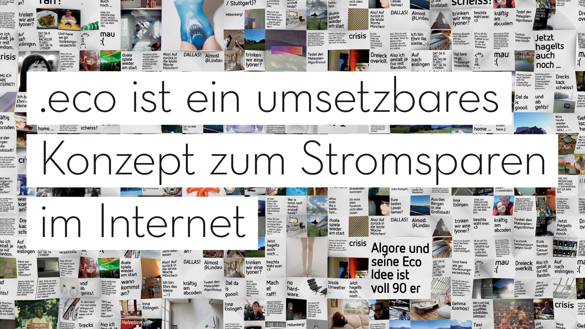 »The proactive concept behind .eco is saving energy on the Internet by reducing data clutter. Short-term current data is provided with a so-called expiration date, thereby inhibiting the growth of useless data. .eco creates awareness and sensitises the users to the environmental impact of data storage.«
