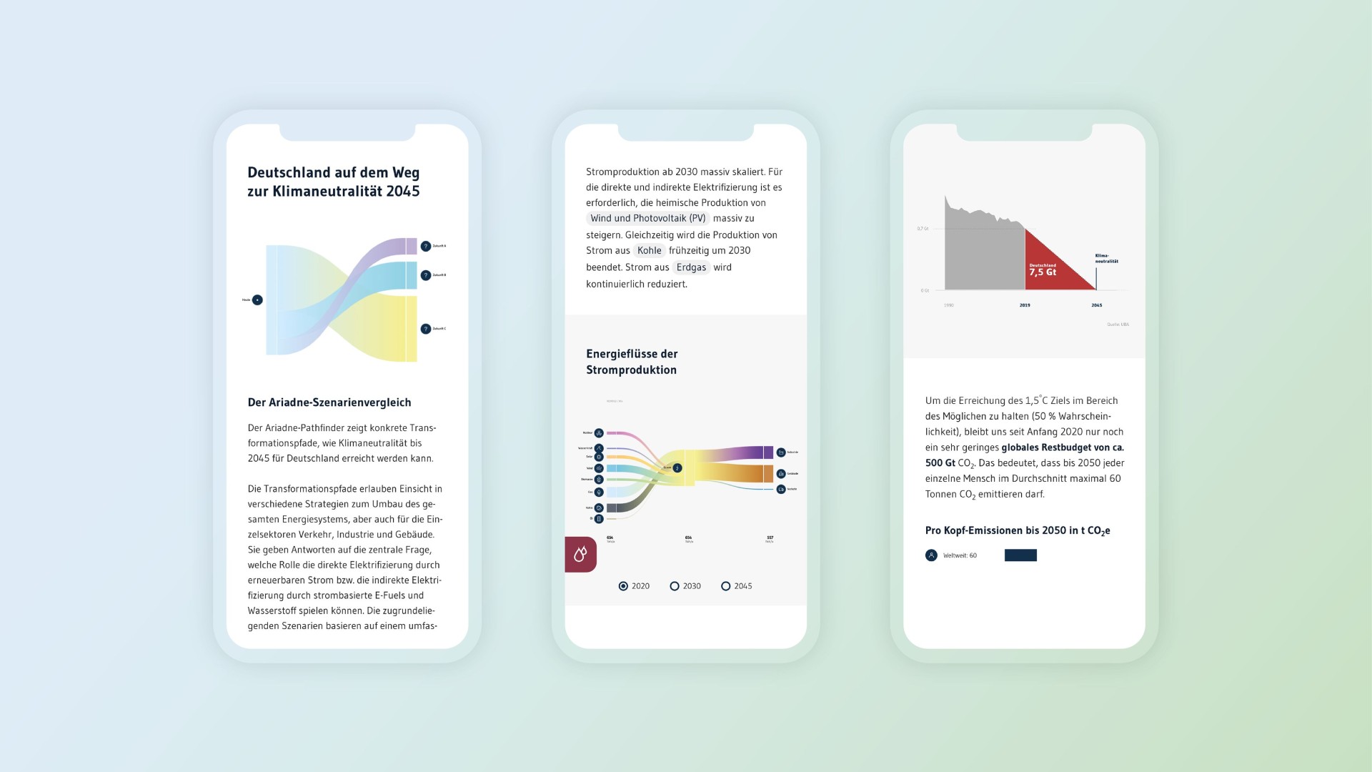 Das Ziel Deutschlands, bis 2045 klimaneutral zu werden, erfordert zügige und tiefgreifende Änderungen in der Energiepolitik. Der Ariadne-Pathfinder zeigt Wege auf, wie dies gelingen kann. Ein interaktives Storytelling führt Nutzer*innen in die Grundproblematik der CO2-Emissionen und der Energieversorgung ein. Animierte Grafiken veranschaulichen die Implikationen verschiedener Technologieansätze, sowohl auf das gesamte Energiesystem als auch auf die Einzelsektoren Verkehr, Industrie und Gebäude. Grundlage der Anwendung sind über 16.000 Datensätze, aus denen das Potsdam Institut für Klimafolgenforschung Rechenmodelle erstellte und die Zukunftsszenarien entwickelte.
