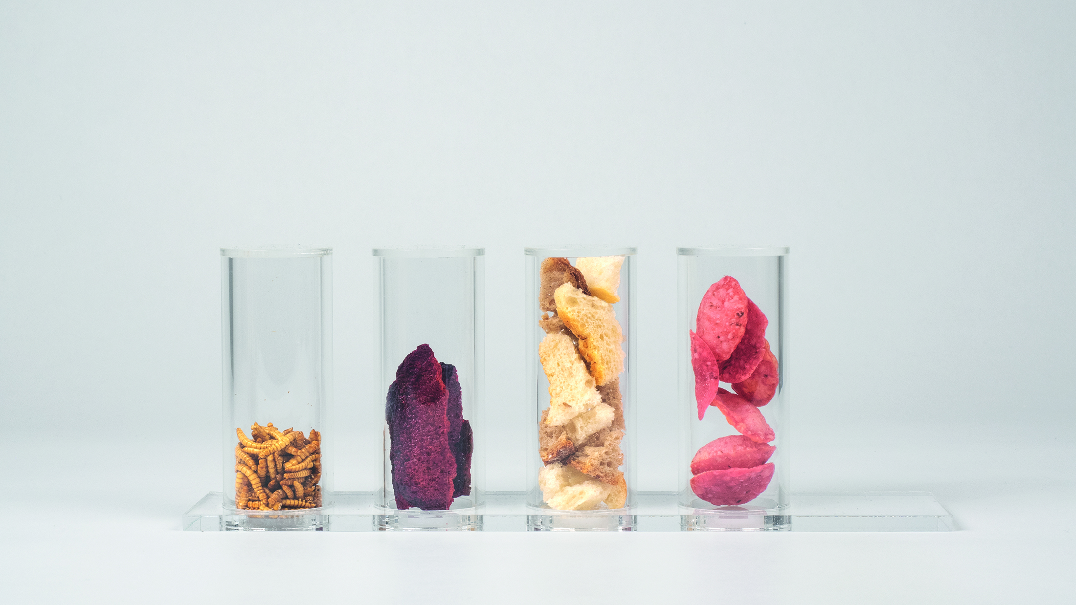 Nach dem Besuch in einer Bäckerei hatte ich erste Ideen, Verknüpfungspunkte in anderen Bereichen der Lebensmittelindustrie zu suchen und mögliche zukünftige Ernährungsweisen einzubinden. Parallel zu meiner Recherche zur Insektenzucht arbeitete ich an Möglichkeiten, überproduzierte Backwaren in neue Produkte zu überführen. Die Chips und Mehlwürmer zusammenzubringen, war letztlich ein logischer Schritt.