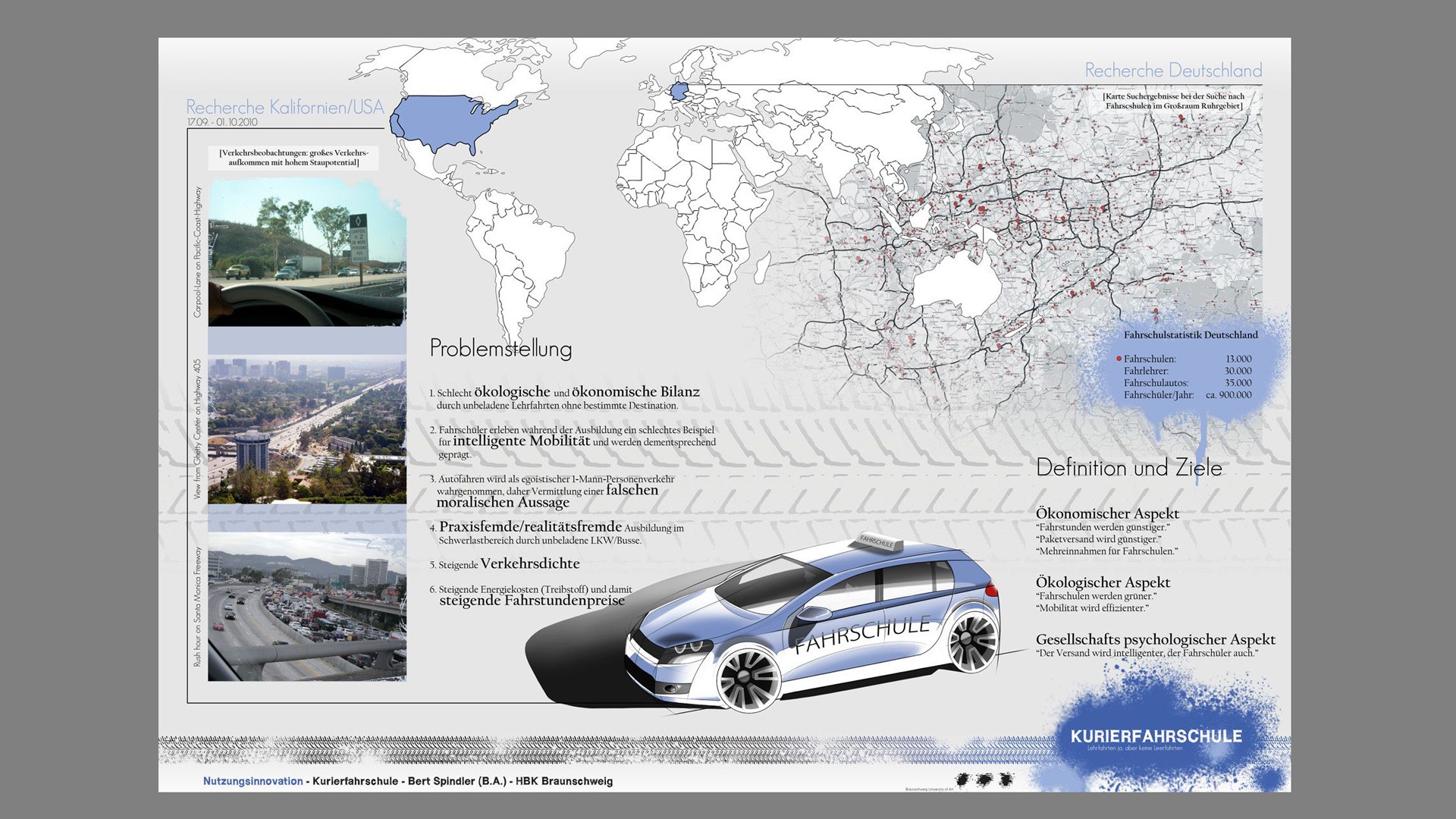 Das Konzept Kurierfahrschule ist eine Synthese aus Fahrschule und Paketzustellung. Wesentliche Vorteile sind: Minderung von Verkehrsaufkommen und CO2-Ausstoß, eine zweite Einnahmequelle für Fahrschulen und günstige Paketlieferung. Fahrschüler erhalten so mehr Verantwortung, Lehrfahrten ein Ziel und Fahrstunden kosten weniger. Es bedarf keiner neuen Ressourcen, Infrastruktur und Fahrzeuge sind vorhanden.