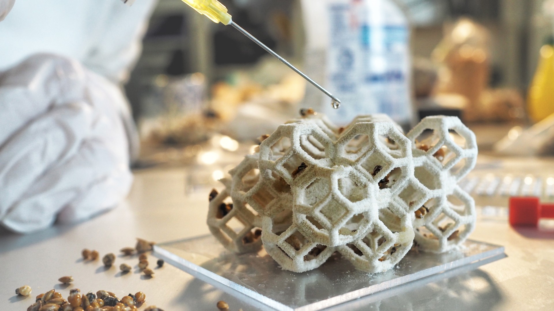 Das Projekt plant b entwickelt zukunftsträchtige und nachhaltige Alternativen für die Herstellung digital gestalteter Strukturen. Im Rahmen der Forschung wurde bereits eine Methode konzipiert, um eine kristalline Raumstruktur aus Zellulose im 3D-Drucker zu fertigen und mit einem wachsenden Organismus (Weizengras und Myzel) und verschiedenen Wachsen (Stearin und Bienenwachs) auszuhärten. Das so entstehende Komposit kann dem Produktionsprozess wieder zugeführt werden und ist biologisch abbaubar.