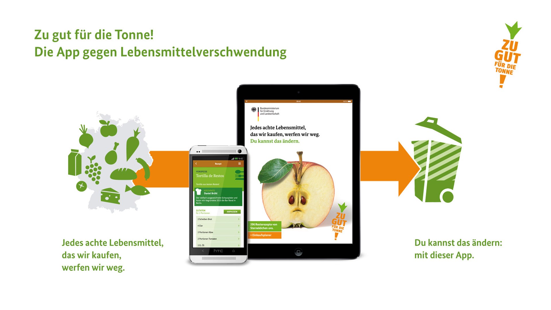 „Zu gut für die Tonne!“ ist eine Initiative zur Reduzierung von Lebensmittelabfällen des Bundesministeriums für Ernährung und Landwirtschaft. Als Medienkampagne gestartet, wird sie als App weitergeführt. Um Bürger zu motivieren, weniger Lebensmittel wegzuwerfen, stellt die App zehn Verhaltensregeln bereit sowie Tipps zur Lagerung und Haltbarkeit und Rezepte zur Resteverwertung. Neben Information bietet sie Benutzerfreundlichkeit durch den integrierten Einkaufsplaner und die Verlinkung zur Website.