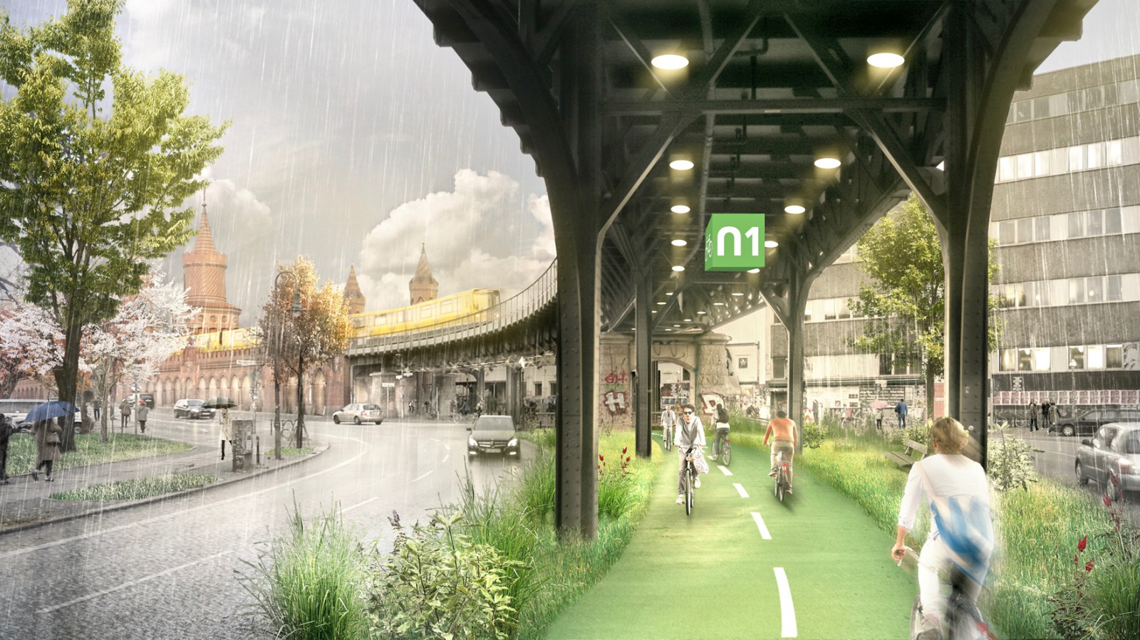When people choose to ride their bicycles and leave their cars at home or even get rid of their cars altogether, particulate matter pollution decreases and the city becomes quieter and prettier. A bold concept suggests building the first roofed cycle path along the U1 line in Berlin.