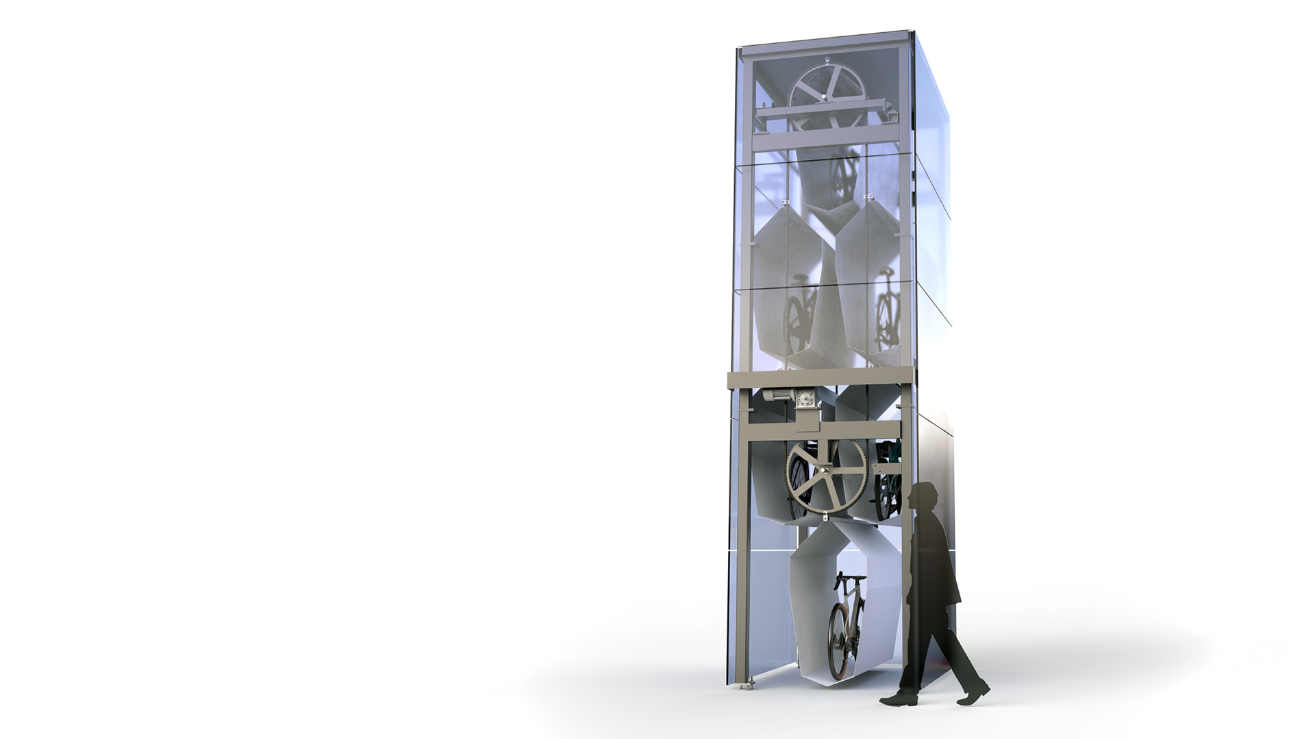 Frido Stutz, a retired airline captain, asked me to develop a bicycle parking solution. This was a topic that had interested me for a long time, and I agreed immediately. Still today, bicycles are often parked chaotically in public spaces. Frido Stutz had the clear idea of stacking the bikes upwards by means of a paternoster elevator. His goal was to safely park up to 60 bikes in the space of a single parked car. Together with my companions, it was possible to realise the idea after about four years of hard work, mostly financed through our personal contributions.