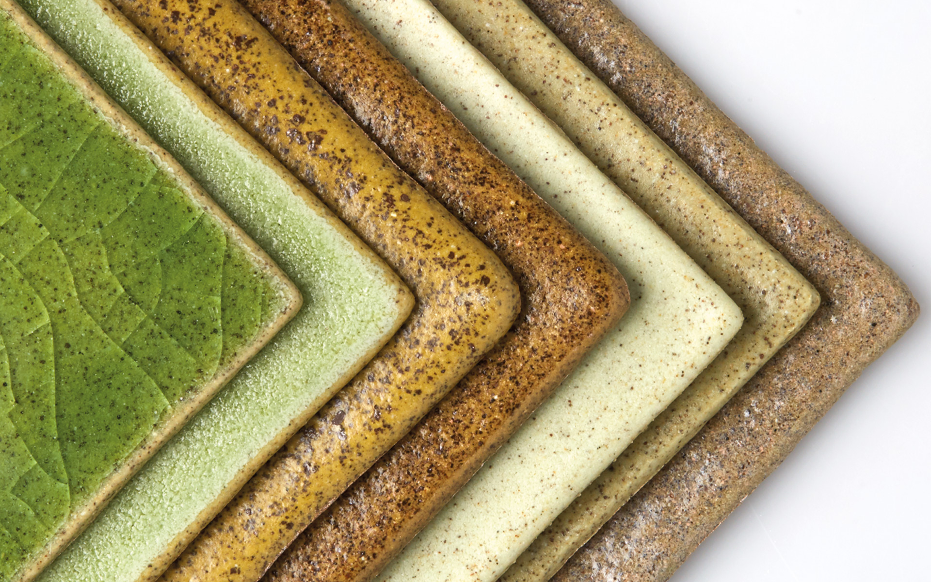Developing a new material is always an audacious and time-consuming endeavour, whereby it is important to remain open to change and to not force the material into a rigid conceptual mould. You work your way up step by step and begin a long process of experimentation. But at some point, the moment comes when you have to decide whether to proceed with the material or with the intended application. In my case, I attempted for a long time to form the material into a bowl. However, all of the laboriously produced bowls emerged flat from the oven. Out of sheer frustration, I let the project sit for a while and devoted myself to other things. It took some months before I suddenly realised what the material wanted to be and how I could employ it properly. That was the hour of birth of the Shards tiles.