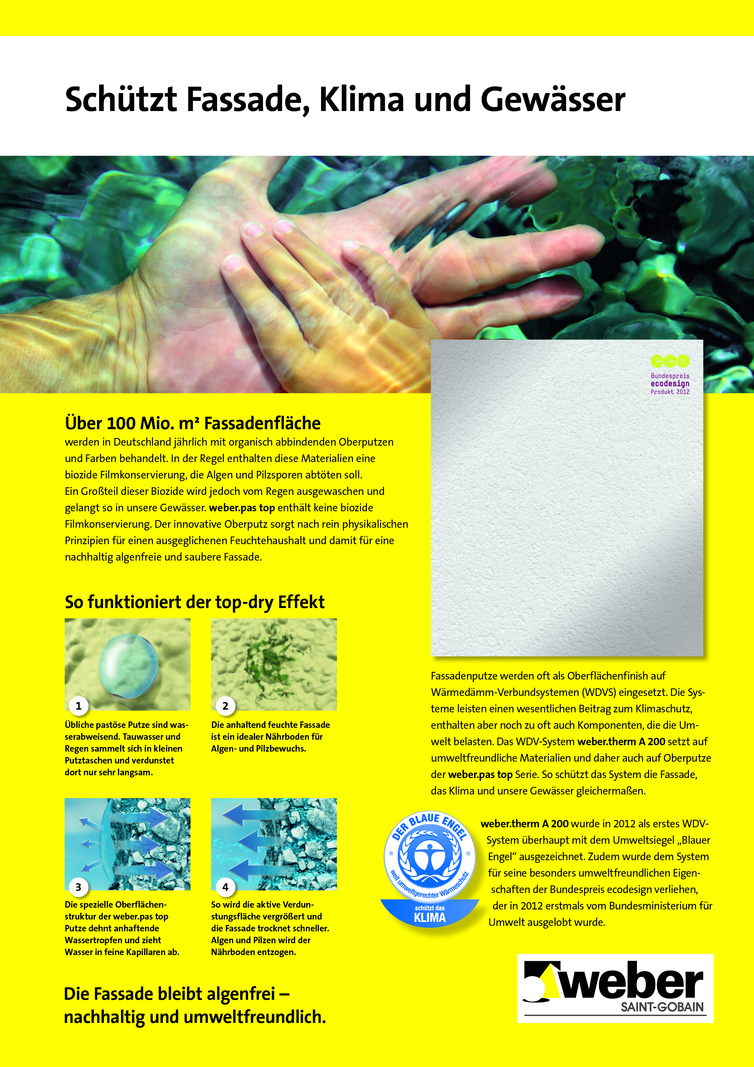 »The render used by the thermal insulation system from Saint-Gobain Weber does not require the use of biocides. Its innovative ʻtechnicalʼ design impressed the jury. The render does not drain the water; instead, using purely physical effects, it gathers it up and increases the size of dew or raindrops sticking to the surface area. In this way, surfaces dry faster. The ecological effect is significant for climate-, resource- and water conservation.«